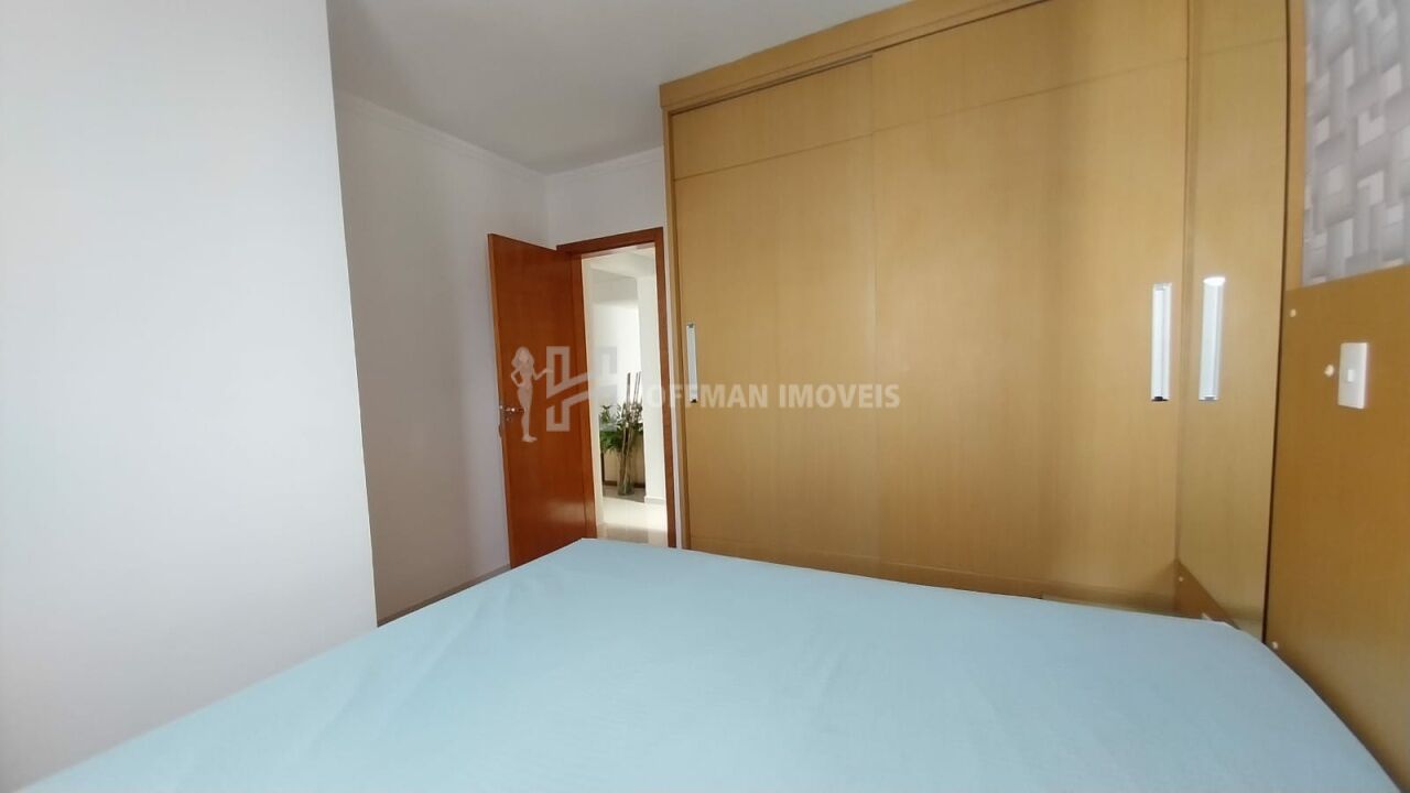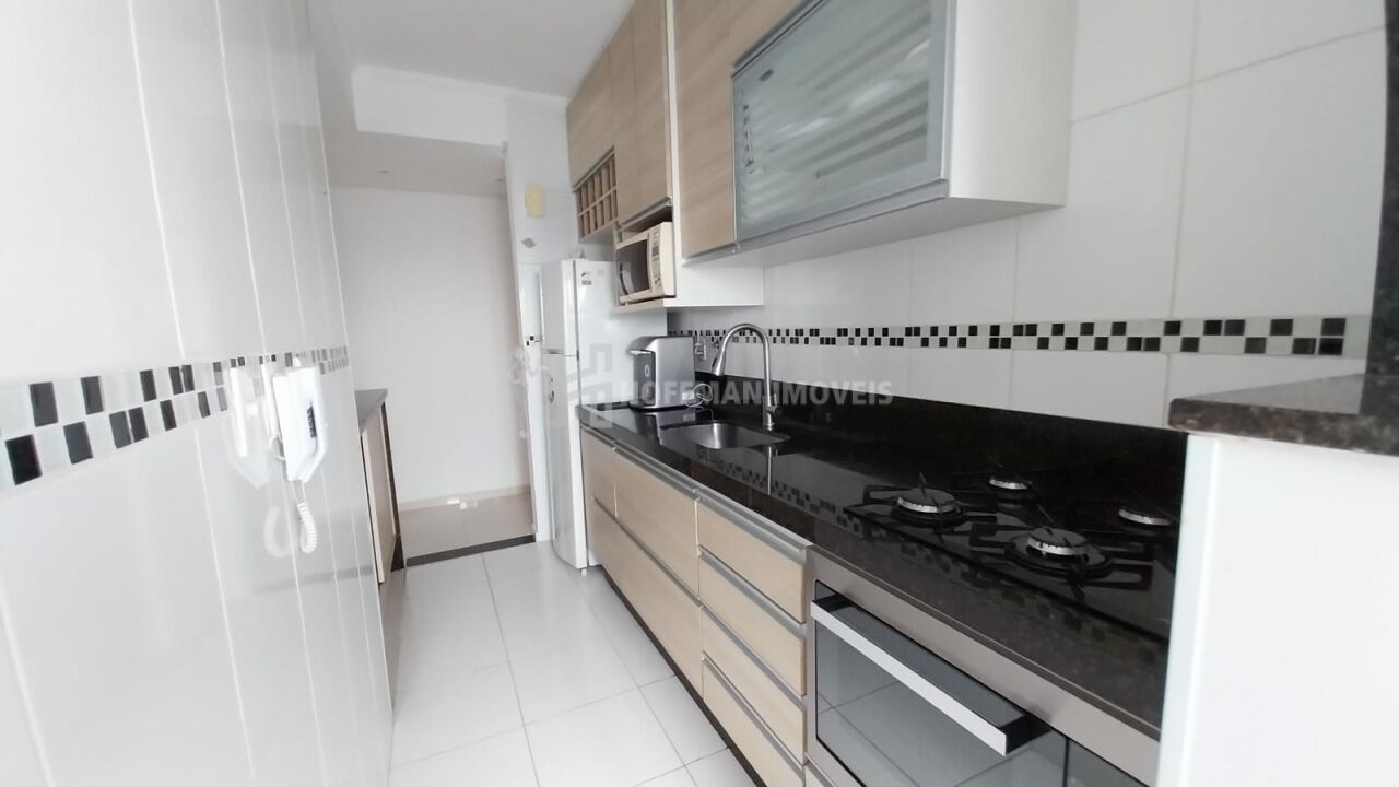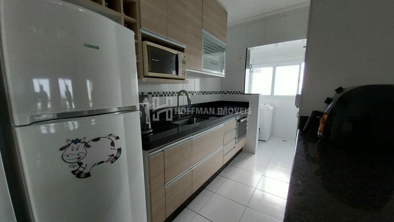 Apartamento mobiliado com armários planejados nos dormitórios, cama, sofá, rack, mesa de jantar, geladeira, cooktop, forno, microondas e máquina de lavar.